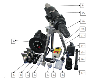 主机箱(A)   1个    配件箱(B)  1个    主机 1台     三脚架 1个    水壶 1个     线盘 1个     起爆器 1个    电发火弹 10个    弹筒 1个    铲形切刀弹 3个    锥形有机玻璃弹 3个   圆柱形钢芯弹 3个   圆锥形钢芯弹 3个   棘轮扳手 1个   退弹杆 1个   水堵 10个   连接短线 1根    合格证 1个   说明书 1