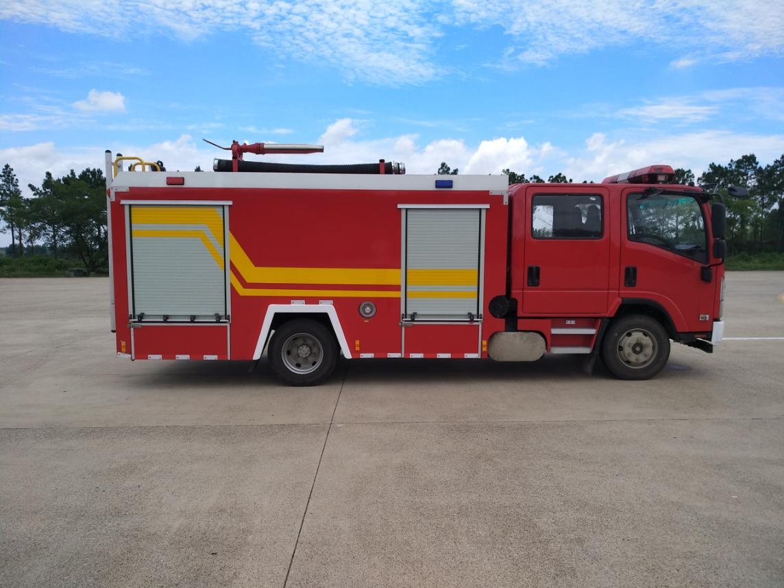 CLW5100GXFSG35/QL型水罐消防车,采用重庆五十铃700P,型号QL1110ANKAY二类底盘改装而成。整车由消防员乘员室和车身两大部分组成,乘员室为双排驾驶室,可乘坐 3+3 人,该车为外露罐结构,车身前部为器材箱,中部为水罐,后部为泵房。载液罐体为优质碳钢,内部喷涂环氧底漆及环氧沥青漆,与底盘采用弹性连接,载水量3550kg,装备了CB20.10/15.30中低压消防泵,额定流量15/30 L/S,车顶安装PS30-50D型消防炮。该车最大的特点是载液量大、操控性好、维修简便。可广泛应用于公安消防队、厂矿企业及社区、码头等场所,扑救大型油类火灾和一般物质火灾。