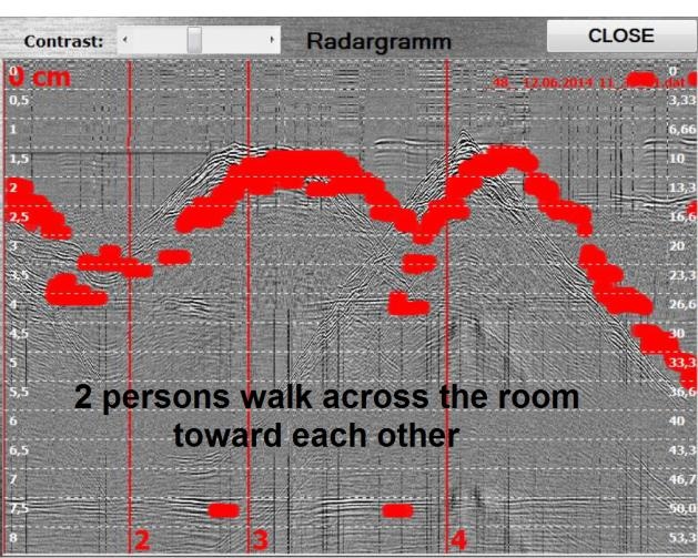 该装置的操作原理是操作者将天线模块导向墙壁。 然后即可在计算机屏幕上观察当物体在墙后移动时反射信号的雷达图的变化。