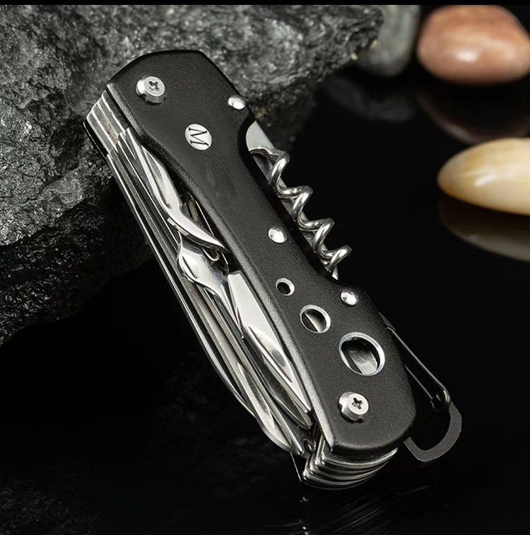 多功能刀又常称为多功能户外刀或万用刀,是含有许多工具在一个刀身上的折叠小刀。多功能刀的组合工具不仅表现在品种上,同时还在于巧妙的组合在同一种工具上,使有限的工具发挥更多的实功能。一把普通的多功能刀,一般都有主刀、小刀、剪刀、开瓶器、木锯、小改锥、拔木塞钻、牙签、小镊子等工具。而在一些工具上还设计了多种功用。