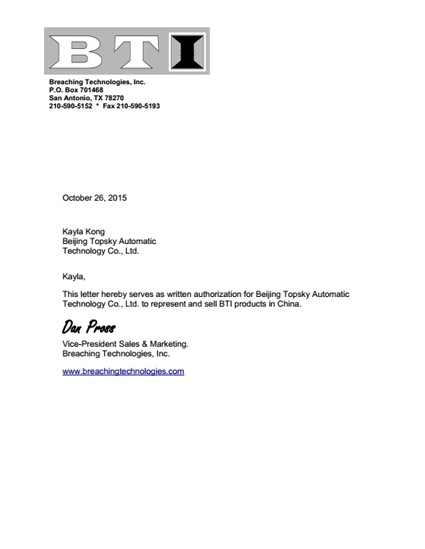 2015年10月26日 ,北京利盈娱乐成为 美国BTI 公司 黑鹰撞门器 一级代理