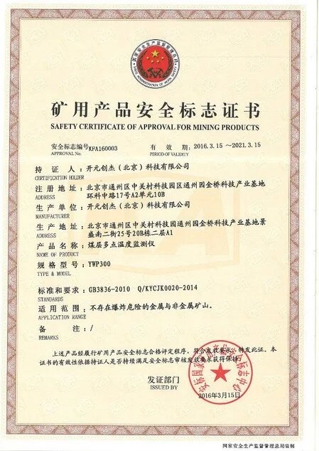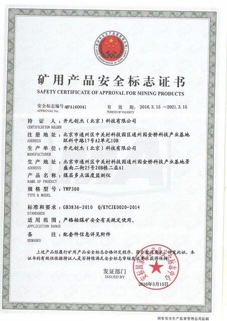 YWP300煤层多点温度检测仪取得安标认证