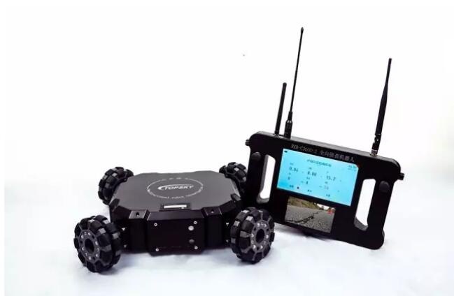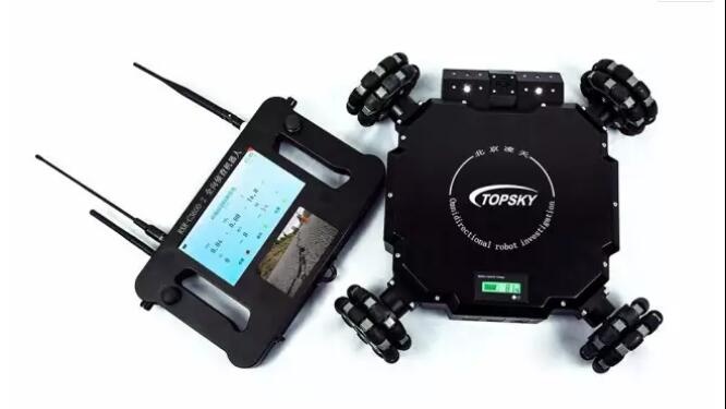 四轮全方位升降侦察机器人是一款集全方位视频监控、可升降云台、有毒有害气体探测系统为一体的移动侦查平台。体积小,有较强的攀爬和越障性能,可部署在狭小空间,威胁、危险区域执行隐秘侦察和监测任务。配装的后场手持终端实时显示移动端全景图像,操作人员可以隐蔽观察控制,通过手持端图像或数据信息完成前端环境判断,降低了在建筑物、地下室、山洞、隧道、街巷和可疑气体泄漏区域内行动的危险性。