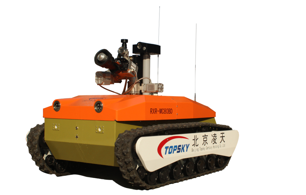 RXR-MC80BD防爆消防灭火侦察机器人采用耐高温履带避震式底盘设计,能够适应救援环境中各种复杂地面。装配环境检测装置,在灭火的同时对现场环境数据进行侦测。机器人由机器人主体,消防炮,环境检测装置,遥控箱四部分组成。主要作用是代替消防队员进入易燃易爆、有毒、缺氧、浓烟等危险灾害事故现场实施有效的灭火救援、化学检测和火场侦察。