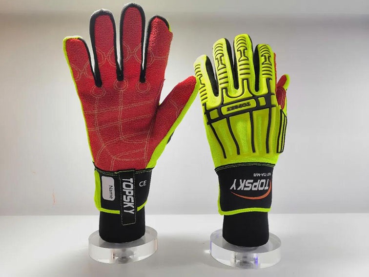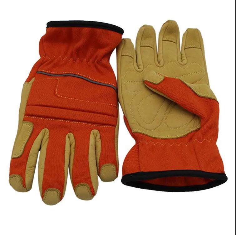 采用3D立体设计,符合人体手型自然弯曲,手掌指尖一片式翻转手指背,主体颜色为橘红色和黄色,主要材质为牛皮和芳纶双面针织布,总体性能符合《GA633-2006消防员抢险救援服装》的标准。