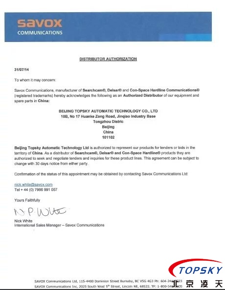 美国SAVOX视频,音频探测仪授权书