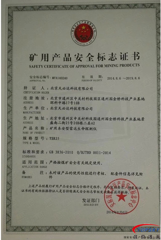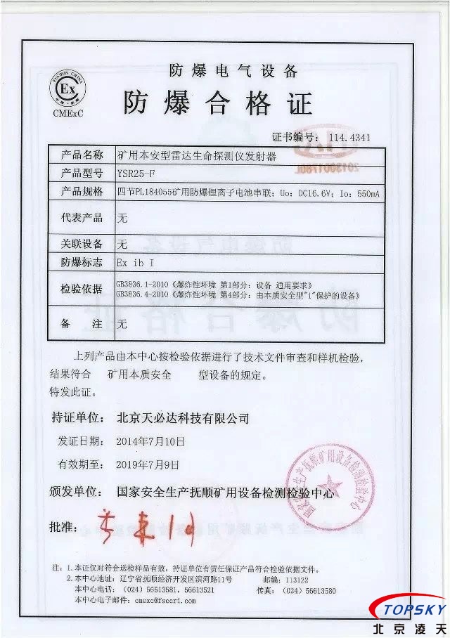 从国家安标中心获悉,YSR25本安型雷达生命探测仪取得煤安标志认证(证书见下图),自此,国内本安型可用于爆炸性环境的探人雷达取得完整下井资质,从研制方获悉,该设备已在山西阳泉煤业集团救护大队、山西潞安集团救护大队、开滦集团救护大队进行过工业性试验,试验效果良好,探测距离达到25米(报告见下图)!