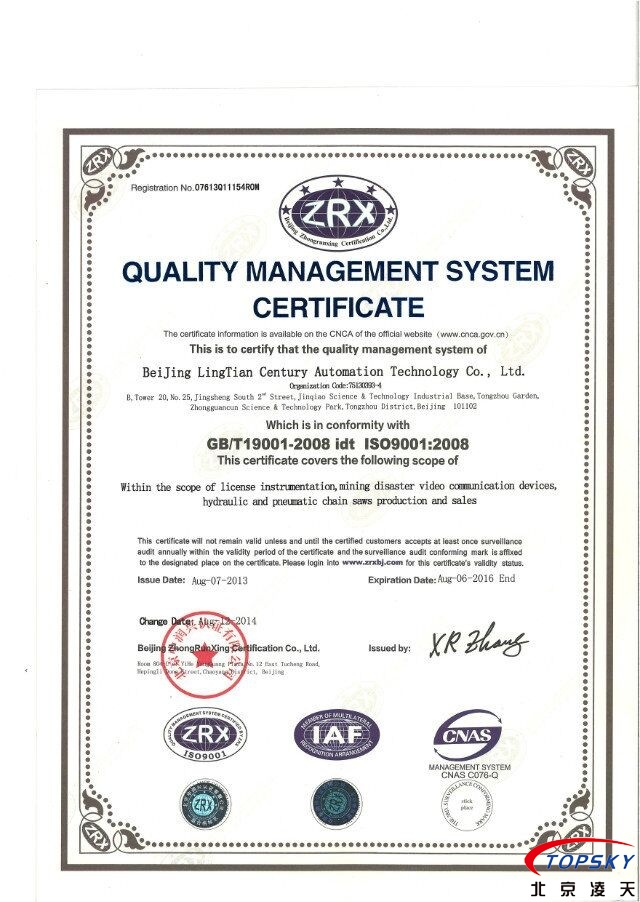 经过严格的评审,我司近期按照GB/T19001-2008质量管理体系要求,已经取得ISO9001质量管理体系认证,认证的获得,标志着我司在管理体系上已经具备较高水平。认证证书的中英文如下: