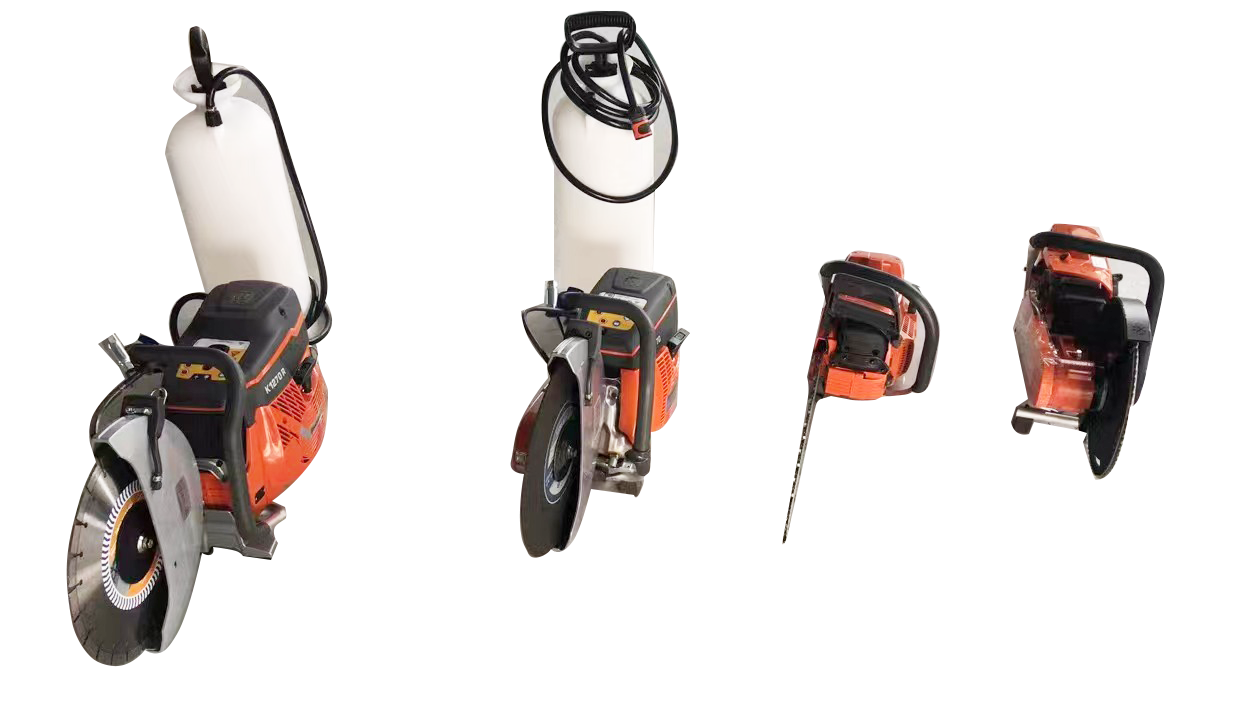 全功能切割锯工具组主机由功率5.8KW的 PJR-K 1270R无齿锯A两台、功率3.7KW的PJR-K770无齿锯B两台、功率3.6KW的PJR-365X机动链锯两台、功率4.1KW的PJR-S/ 115J机动双轮异向切割锯两台、以及锯片,链条、冷却水壶、火花塞、加油配比壶及其它附件组成。 |