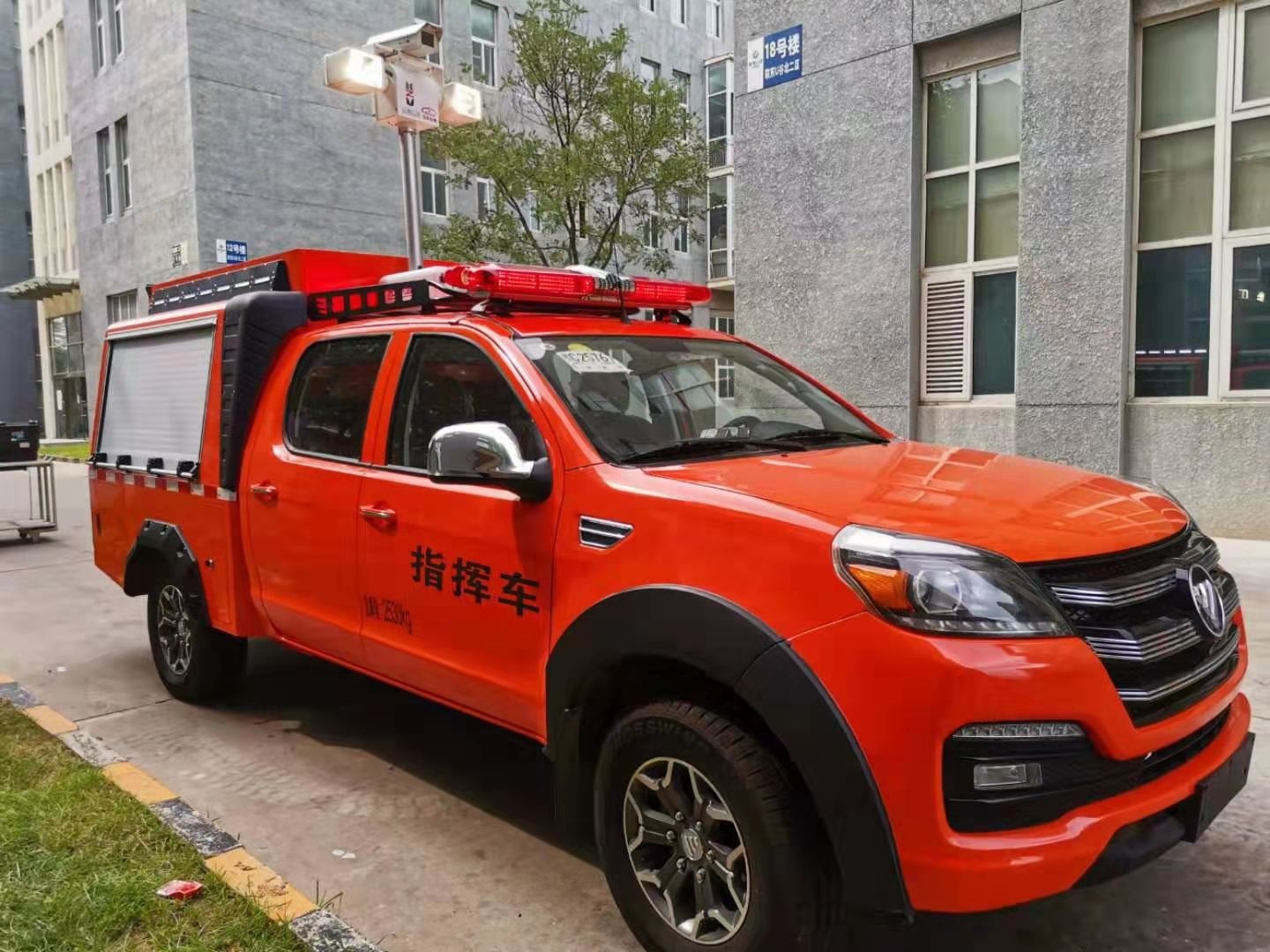 专门为特种机器人量身定做的一款机器人运输车,由皮卡车改装,区别于传统意义上大型运输车,体积更小,动力更足。车厢设计有升降照明系统,解决了救援现场能见度低的问题,1.2-1.8米升降高度,可满足不同照明需求。车体顶部装有4G图像传输系统,可将现场情况实时传输到指挥部,有利于指挥现场调度。配有一体化机器人装运梯,最大承压≥600Kg。后箱四周配有一圈小型照明系统,可用于晚间或光线昏暗等环境。后箱设计有独立储物架,可放置机器人配套设备。两侧卷闸窗设计方便拿用。