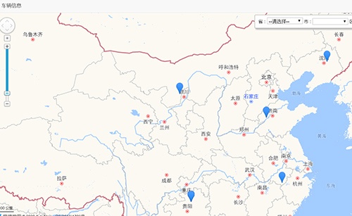 车辆信息管理功能,可在地图上查阅所有车辆标注当前位置及点击某个具体的车辆,显示该车辆的车牌号、车辆类型、车辆名称、车辆状态、车辆经纬度坐标、车辆及功能描述详情。
