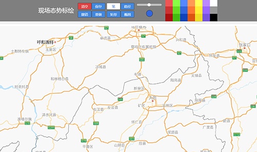 现场态势标绘,可进入到地图中,进行线路的制作、路径、矩形、圆形等操作选择,及可对操作步骤进行撤销及画笔的颜色选择