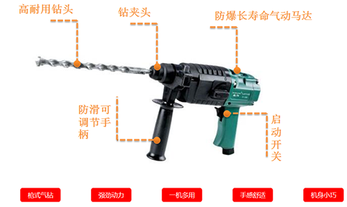主要用于岩石,砖墙,混凝土等构件上凿孔,作安装管道、架设动力线路、安装地脚螺栓、化工厂、精炼厂、建筑、重工业、危险潮湿的隧道、水下及狭窄的空间作业;尤其在高瓦斯防爆矿井中,气动防爆无火花更能体现安全性。它是提高工效,减轻劳动强度的工具.