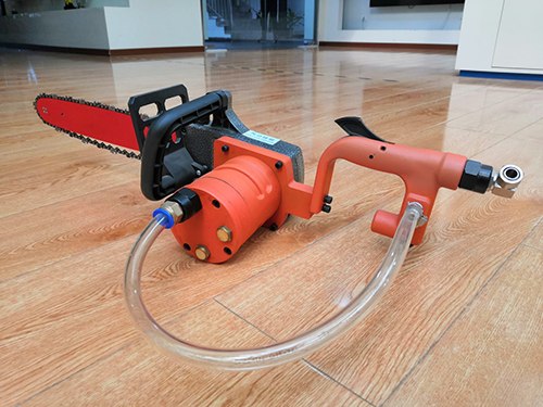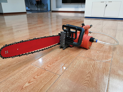 气动锯由锯头、链条、聚氨酯软管三大部分组成,聚氨酯软管将气源和气动锯连接起来,气源提供的气压驱动气动锯高速运转,进行切割。工作时,冷却水通过导板中间的孔流向切割部位,起到冷却和降尘的作用。
