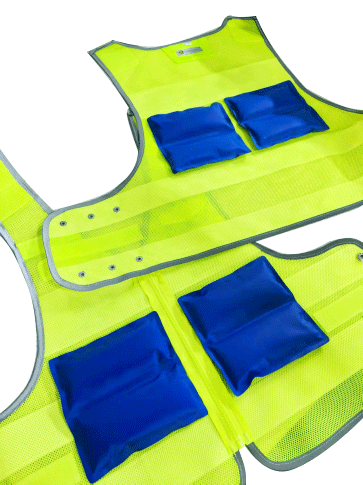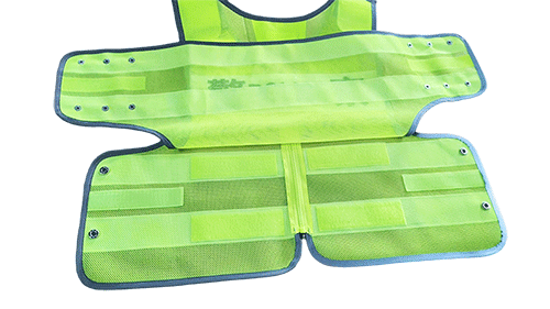 温控警用背心(低温型)为前开襟马甲式样,开襟用拉链拉开,前后身分别具有两道横向反光带;前身胸部左右分别缀钉胸微、警号锦丝搭扣带绒面、对讲机袢、前后身两侧用锦丝搭扣及铜制四合扣连接,针对不同腰围三档调节肥瘦;可根据不同身高调节长短