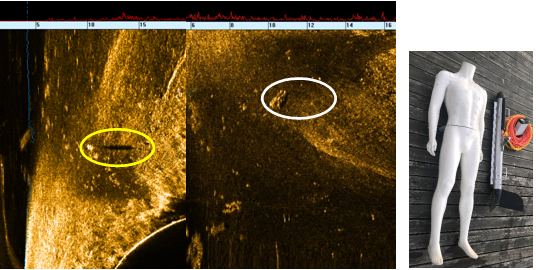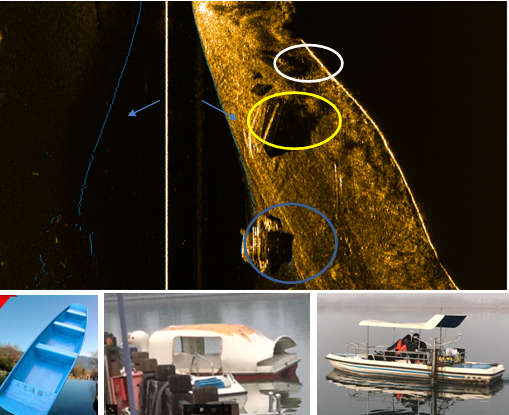 其中,蓝色箭头指向蓝色线条为自动检测的水底线,三艘沉船,分别对应实物如下,小船约为3米长,大船约为5米长。