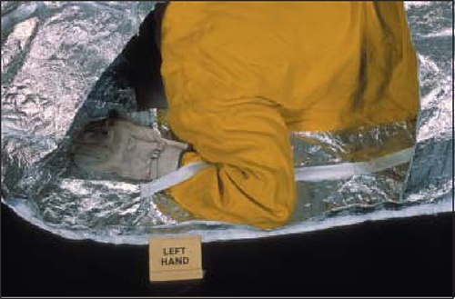 1)展开避火罩时,一定要用手臂和腿、脚固定住避火罩,这样既可以防止避火罩被风吹走,又可以随时进出避火罩内;