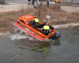 针对水灾频发的地区,水域救援任务必不可少。但往往洪涝灾害、城市内涝往往伴随着恶劣的天气和崎岖的地形,冲锋舟需要多次搭载不同交通工具并数次转移,水陆两栖全地形车可以轻松通过水淹、泥泞、沼泽等环境,无需人力搬运,实现陆地驾驶和水中行走自由切换,以最快的时效抵达现场实施救援。
