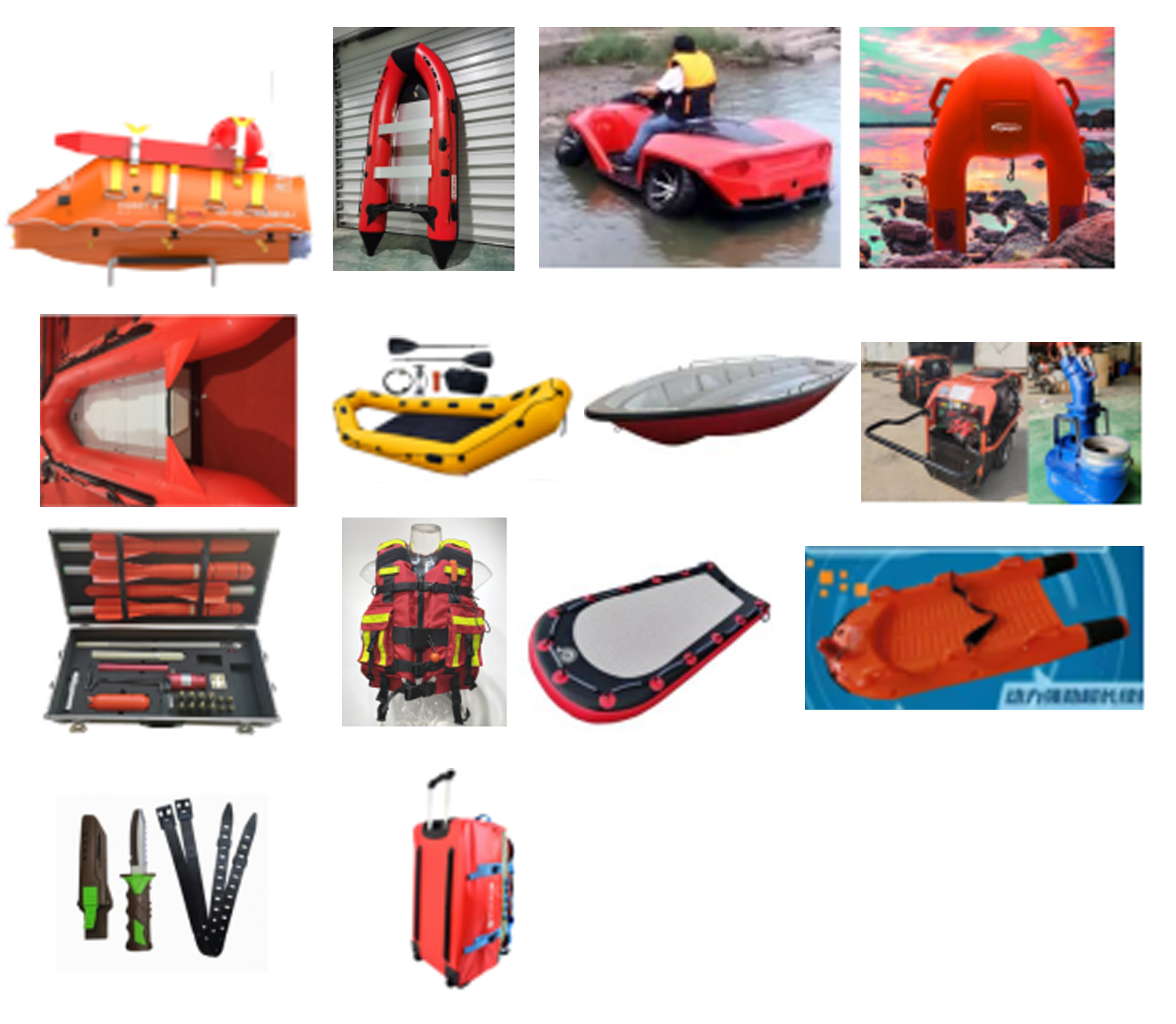 用于溺水、内涝事故救援及孤岛转移等任务,可选配超浅水充气救援船、水面无人救援艇、水陆两用救援艇、充气式救援筏、皮划艇、冲锋舟、便携式 液压抽水泵、救生抛投器、遥控救生器、救生衣、水上救生浮板、水上救援 担架、割绳刀、便携式救援包等