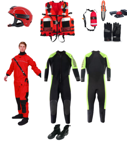 由水域救援头盔、水域救援手套、水域救援靴、激流救生衣、特级干式/湿式救援服,大音量救生口哨、水域救生刀、多用途信号灯、抛绳包等组成。