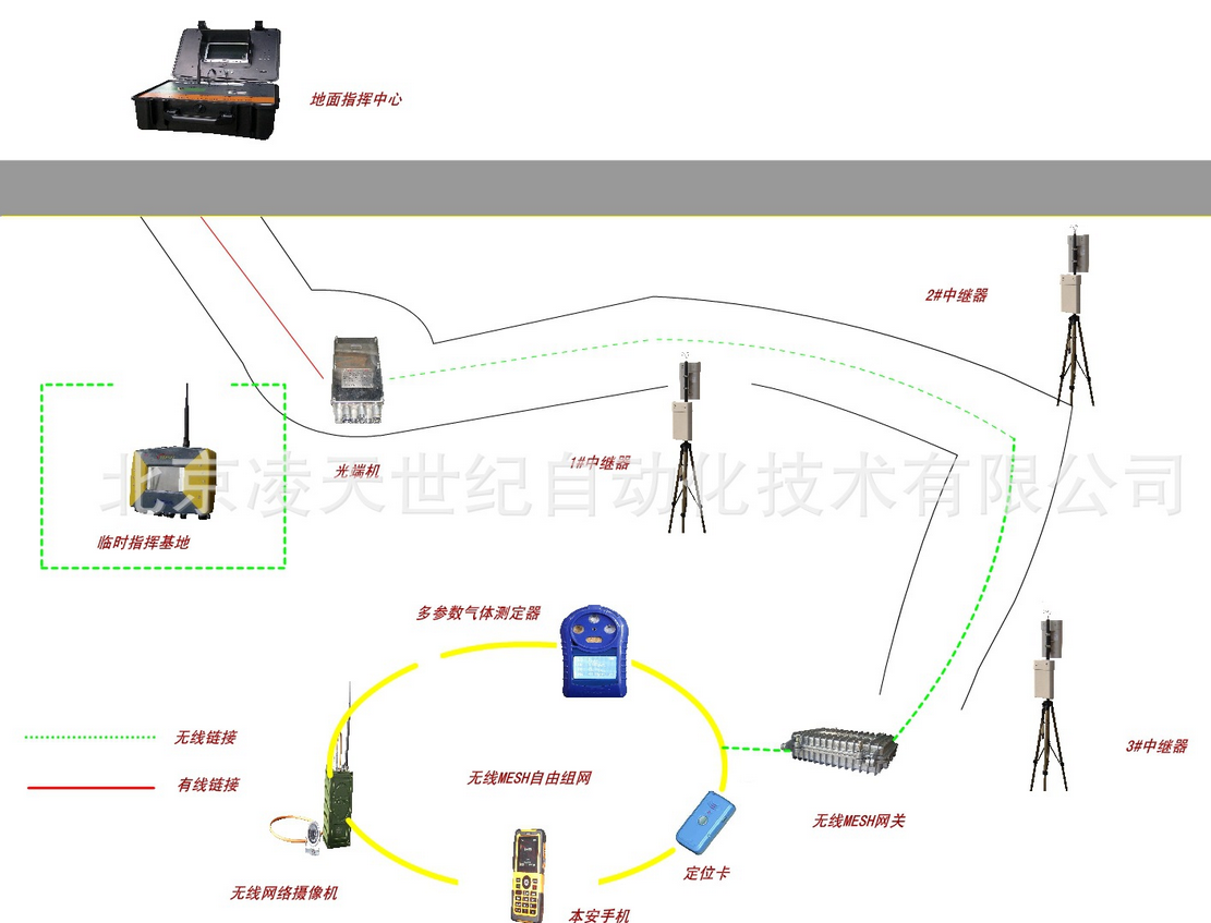 它不需要依赖管道等介质,不同与泄露通信,特别适合于抢险救灾,与国内外同类产品相比。该装置轻巧便携,能在隧道、地下建筑和复杂建筑群的地方无线传送语音和灾区环境信息。无线发射器及摄像头,由救护队员随身携带,它可以实时地将现场的音视频信息传输到基站,基站再将信号传到地面指挥中心。井下灾区的救护队员、井下救援基地和地面指挥中心之间可进行实时信息沟通,救援全过程的图像、语音资料可完整储存并回放,为今后进行事故原因分析、总结抢险救灾经验教训提供基础资料。若同时连接互联网,救援指挥中心及指导专家可实时了解灾区救援情况。