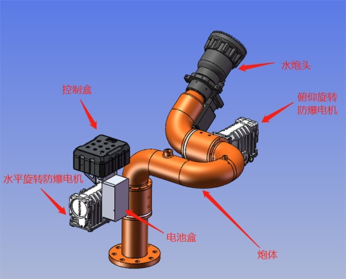 水炮头的最大雾化角度可达120°,使得水炮的雾化喷射范围更大,为大面积给火场降温提供了更大帮助,同时,雾化的水雾颗粒可以快速汽化隔绝火场周围的空气,达到切断燃烧要素快速灭火的目的