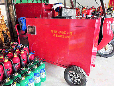 用于乡村社区的一款小型可移动灭火站.此装备是由动力机、水泡沫药剂箱、高压软管、高压喷射细雾枪、泡沫灭火剂、干粉灭火器、破拆工具组和载体车等组成。