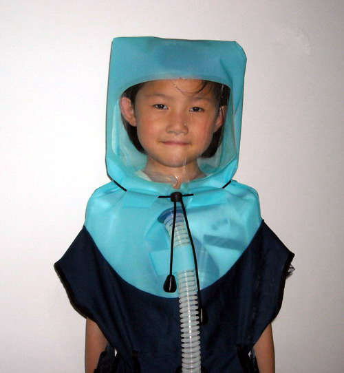 适合儿童(3—8岁)使用,为有效回避战争毒气或有害环境而设计的防毒面罩。利用送风机将外部空气通过滤毒罐送入头罩内,形成密闭正压,使得呼吸方便,活动无不适现象。
