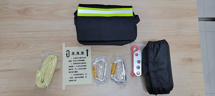 多功能绳包具有阻燃和防水的特点,还可拆卸充当墙角护垫和绳索护套使用,可提高绳索使用的安全性,安全绳具有阻燃、耐高温、强度高、重量轻等特点并带有清晰的反光标识,配合轻质高强度铝合金的安全钩、下降器使用,使逃生人员、消防员可以快速完成逃生自救。