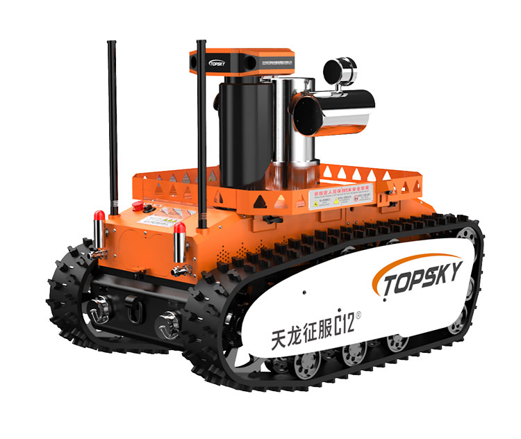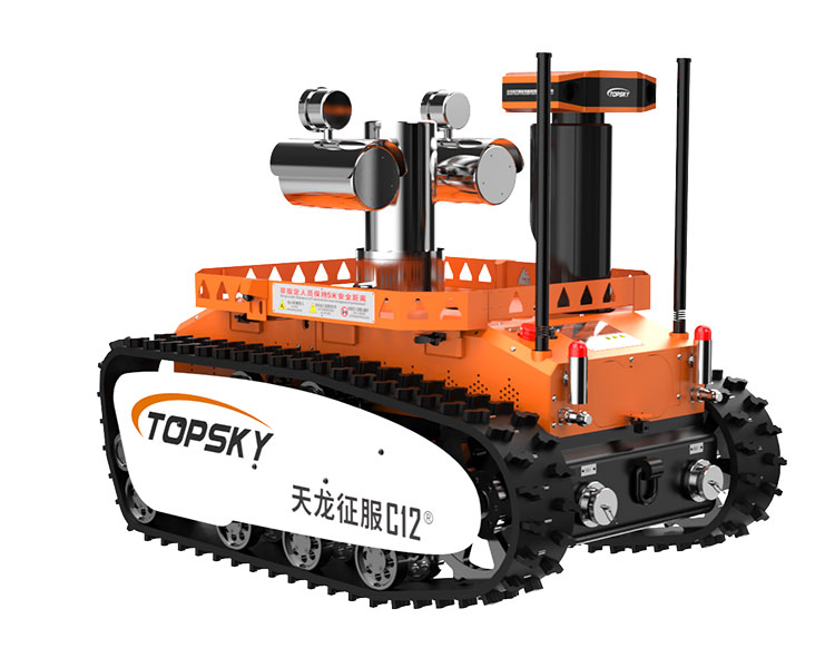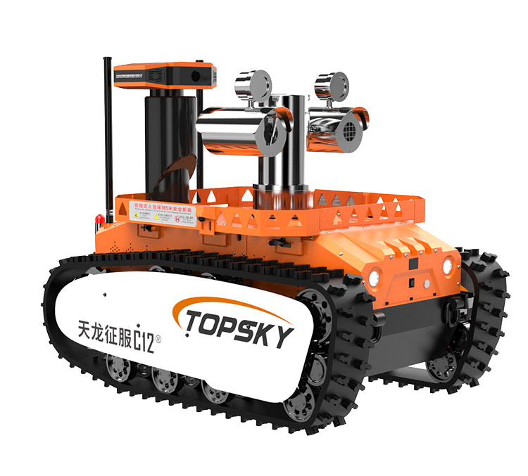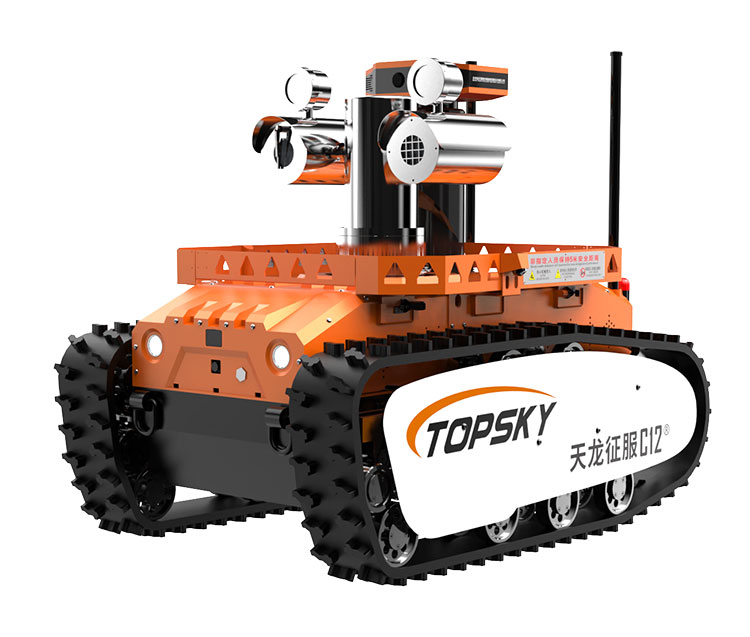 主要功能:履带式防爆机器人底盘采用锂电池电源作为动力源,使用无线遥控的方式远距离操控,可搭载形式多样,原地旋转设计可使得运更灵活;具备音视频侦察、有毒有害气体侦察、灾区环境侦察功能,对提高救援安全性、减少人员伤亡具有重要意义。